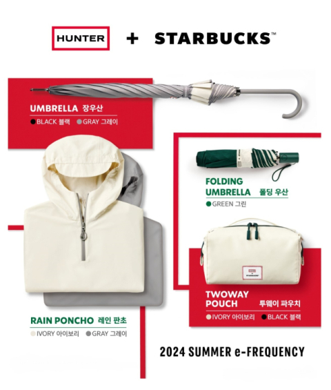 스타벅스 코리아가 명품 레인 부츠로 잘 알려진 영국 프리미엄 브랜드 헌터(HUNTER)와 손잡고 16일부터 7월 4일까지 총 7종의 증정품을 선보이는 ‘2024 여름 e-프리퀀시’ 이벤트를 진행한다.