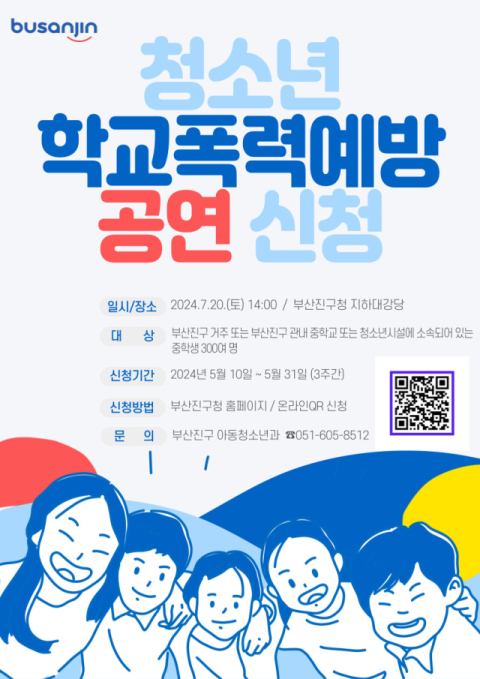 부산진구(구청장 김영욱)에서는 2024년 7월 20일 청소년들에게 건전한 환경을 만들어주고자 청소년을 위한 학교폭력예방 공연을 개최한다.