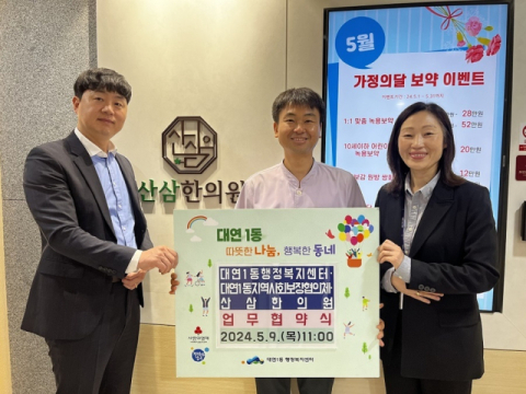 대연1동(동장 강태남)은 5월 9일 지역 내 의료복지의 질을 개선하고, 취약계층 보호를 강화하기 위하여 대연1동행정복지센터, 대연1동지역사회보장협의체 및 산삼한의원과 업무 협약을 체결하였다.