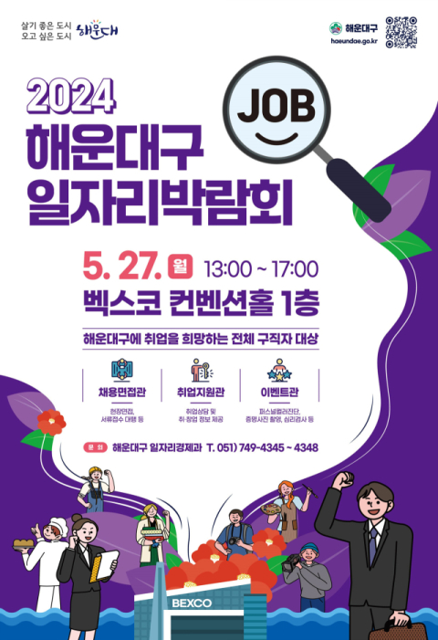 해운대구(구청장 김성수)는 27일 오후 1~5시 벡스코 제1전시장 컨벤션홀에서 ‘2024년 일자리박람회’를 개최한다.