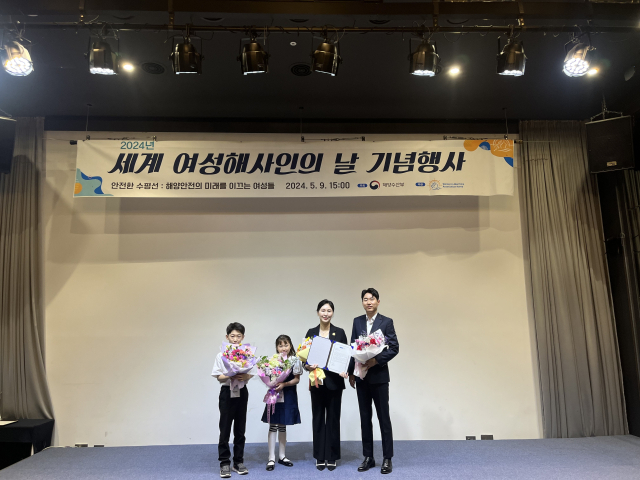 지난 9일 부산 영도구에서 열린 제3회 세계 여성 해사인의 날 기념행사에서 제1회 IMO 양성평등상을 수상한 한국선급 허은정(왼쪽 3번째) 책임검사원 가족들이 기념사진을 찍고 있다. 한국선급 제공