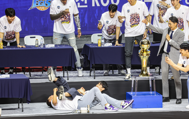 15일 부산 사직실내체육관에서 부산 KCC 이지스 프로농구단이 23-24시즌 챔프전 우승 기념 팬페스타 행사가 열려 송교창이 전창진 감독에게 암바를 걸고 있다. 김종진 기자 kjj1761@