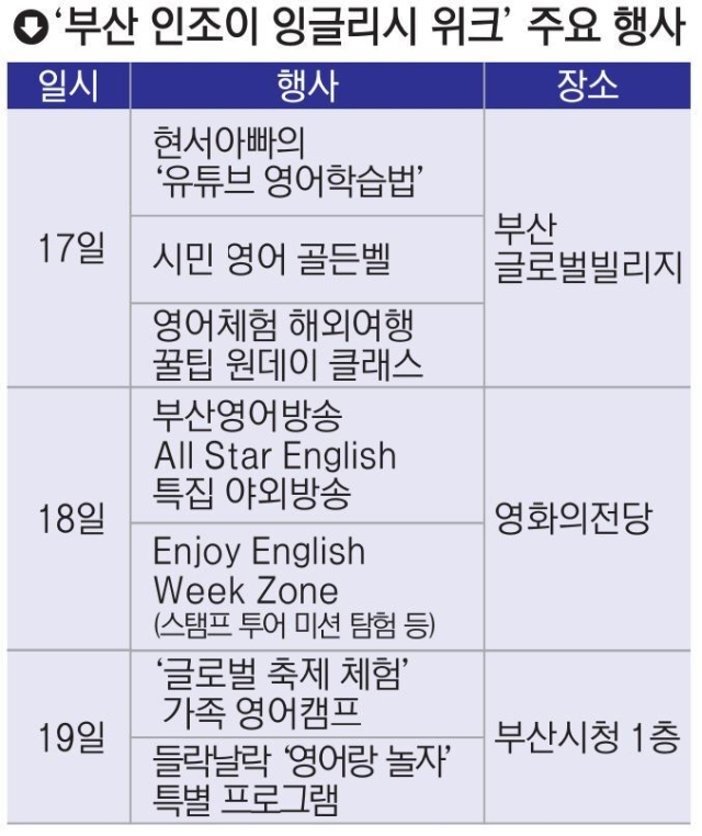 부산시는 17~19일 부산진구 부산글로벌빌리지, 해운대구 영화의전당, 연제구 부산시청에서 ‘2024 부산 인조이 잉글리시 위크(Busan Enjoy English Week)’를 개최한다고 15일 밝혔다. 부산시가 글로벌 허브도시 부산을 위해 ‘영어 하기 편한 도시’로 만들겠다고 선언한 이후 올해 처음으로 이번 행사를 기획했다. 모든 행사는 영어로 진행된다.
