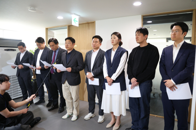 국민의힘 소장파 모임인 ‘첫목회’ 소속 이재영 간사가 15일 서울 경제사회연구원 앞에서 총선 패배 원인과 당 수습 방안 등에 대한 끝장 밤샘토론 결과를 발표하고 있다. 연합뉴스