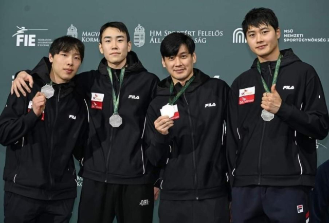 3월 24일(현지시간) 헝가리 부다페스트에서 열린 남자 사브르 월드컵 단체전에서 미국에 이어 준우승을 차지한 한국 펜싱 남자 사브르 대표팀. 왼쪽부터 박상원(이상 대전광역시청), 구본길(국민체육진흥공단), 도경동(국군체육부대), 오상욱. 연합뉴스