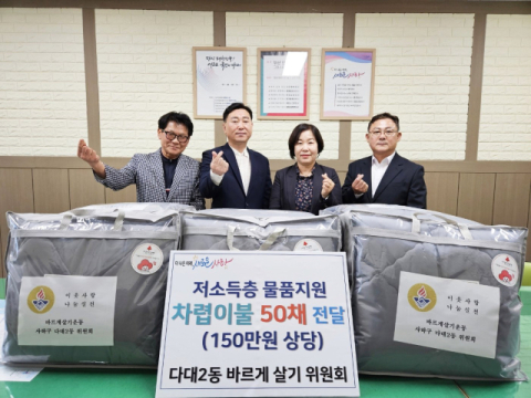사하구 다대2동 바르게살기운동 위원회는 지난 5월 14일, 여름 차렵이불 50채(150만 원 상당)를 다대2동 행정복지센터에 전달했다.