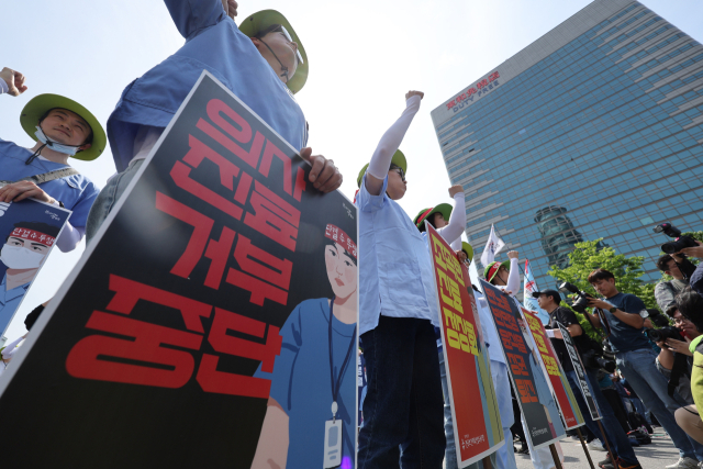 서울고법 행정7부는 16일 의대생과 의대 교수, 전공의 등 18명이 정부를 상대로 낸 항고심에서 기각 또는 각하 결정을 내렸다. 보건의료노조 조합원들이 지난 1일 2024 세계 노동절 대회에서 올바른 의료개혁과 의사 진료 거부 중단을 촉구하는 장면. 연합뉴스