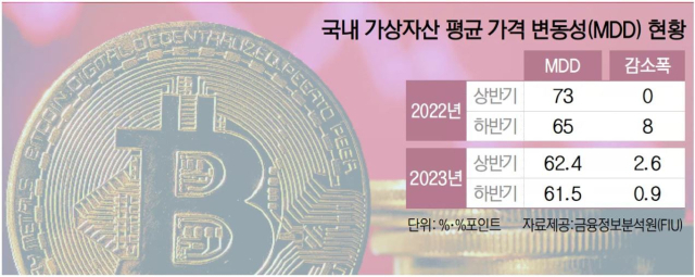 19일 금융위원회 산하 금융정보분석원(FIU)이 발표한 ‘2023년 하반기 가상자산사업자(VASP) 실태조사 결과’에 따르면 지난해 하반기 국내 가상자산 거래소에 상장된 코인들의 평균 가격 변동성(MDD)은 61.5%로 집계됐다. MDD는 최고가에서 최저가를 뺀 값을 최고가로 나눈 결과다.