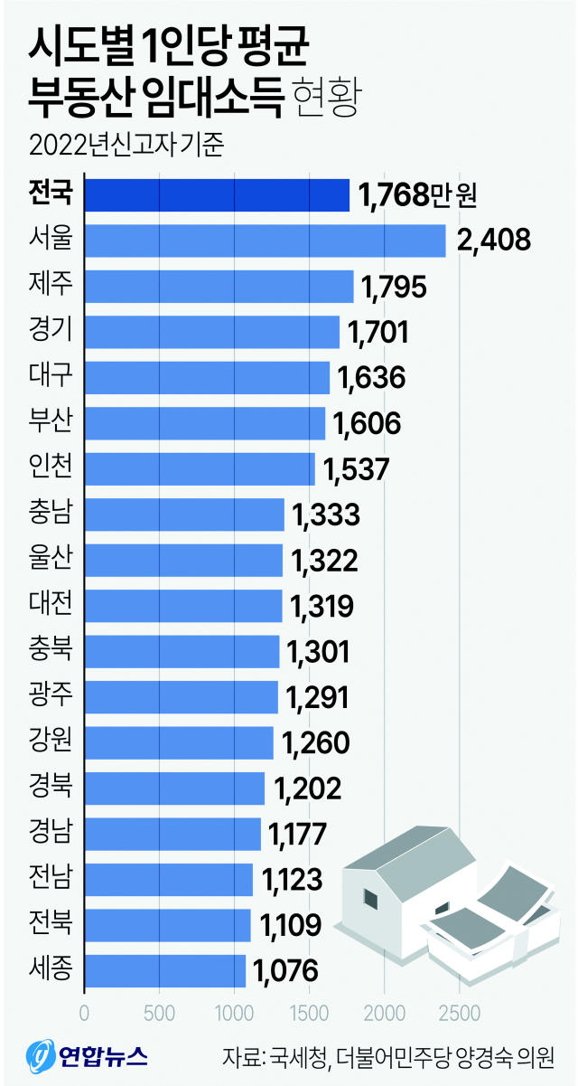19일 국회 기재위 더불어민주당 양경숙 의원이 국세청에서 받은 ‘시도별 부동산 임대소득’에 따르면 2022년 종합소득세 신고자 가운데 부동산 임대소득을 신고한 사람은 모두 124만 6714명이었다.