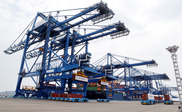 지난달 5일 개장한 부산항 신항 7부두(서컨테이너부두 2-5단계)에서 하역 작업이 진행되고 있다. 정종회 기자 jjh@