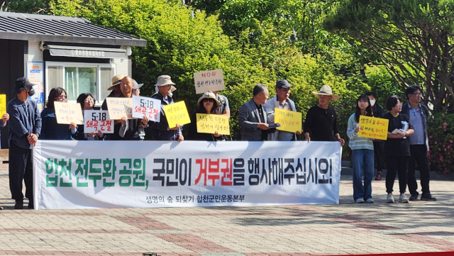경남 합천군 시민단체 관계자들이 제44주년 5·18 민주화운동 기념일인 지난 18일 광주 북구 국립 5·18 민주묘지에서 합천에 자리한 일해공원 철거를 촉구하는 현수막을 들고 있다. 연합뉴스