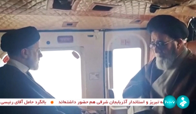 추락 사고가 발생하기 전 에브라힘 라이시 이란 대통령(왼쪽)이 19일(현지시간) 동아제르바이잔주 바르즈건 지역에서 열린 기즈 갈라시 댐 준공식에 참석한 뒤 타브리즈로 돌아오기 위해 헬기에 탑승해 있다. AFP연합뉴스