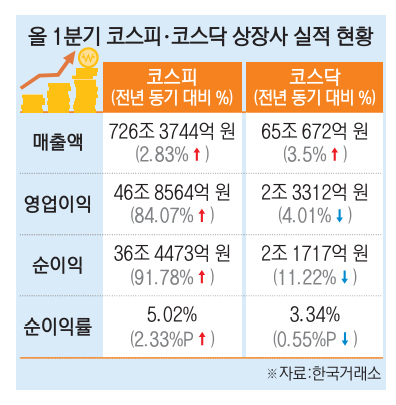 올해 1분기 유가증권시장(코스피) 상장사들이 남는 장사를 기록했다. 특히 순이익률은 지난해보다 2배 가까이 증가했다. 반면 코스닥 상장사들의 경우 매출은 증가했지만, 영업이익과 순이익이 감소해 밑지는 장사를 했다.