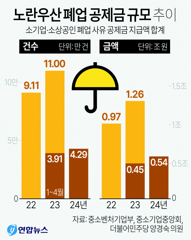 20일 국회 기획재정위원회 소속 더불어민주당 양경숙 의원이 중소벤처기업부·중소기업중앙회에서 제출받은 자료에 따르면 지난 1∼4월 노란우산 폐업 사유 공제금 지급액은 5442억 원으로 지난해 동기보다 19.9% 늘었다. 공제금 지급건수는 4만 3000건으로 9.6% 증가했다.