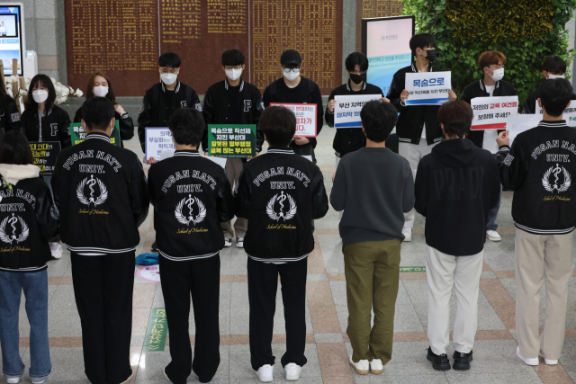 지난 7일 부산대 대학본부 1층에서 부산대 의대 학생과 교수들이 의대 증원 추진에 반대하며 피켓 시위를 하고 있다. 연합뉴스