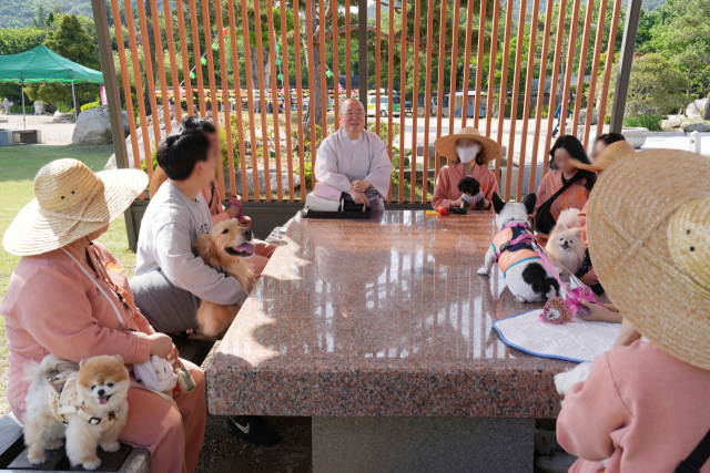 반려견과 함께하는 템플스테이 ‘멍콕 템플스테이’가 부산에서 최초로 금정구 두구동 홍법사에서 개최됐다. 지난 10일 홍법사 주지 심산스님과 참가자들이 이야기를 나누는 모습. 비바인사이트 제공