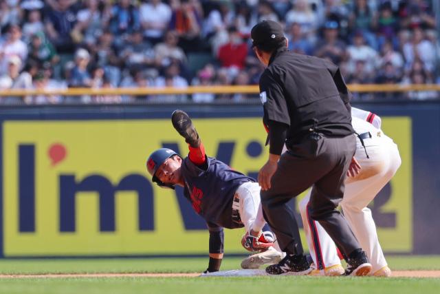 롯데 자이언츠 장두성이 지난 19일 서울 잠실야구장에서 열린 2024 KBO리그 두산 베어스와 경기에서 7회초 대주자로 나서 도루에 성공하고 있다. 연합뉴스