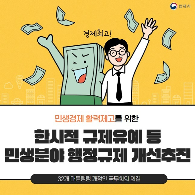 법제처는 민생경제 활력을 높이기 위한 32개 법령의 개정안에 관한 시행령이 21일 국무회의에서 의결됐다고 밝혔다.