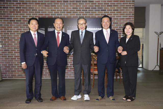 국민의힘 황우여 비상대책위원장(왼쪽 두 번째)이 21일 서울 강남구 이명박 전 대통령 사저를 방문해 이명박 전 대통령(왼쪽 세 번째)과 기념 촬영하고 있다. 연합뉴스