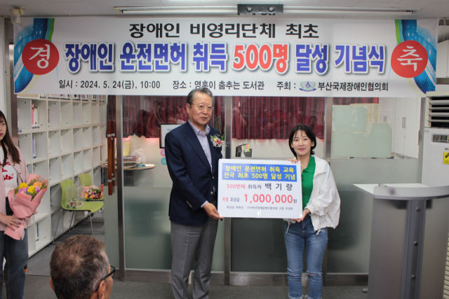 부산국제장애인협의회는 24일 부산 동구 초량동 커피타운 빌딩 6층 ‘영혼이 춤추는 도서관’에서 장애인 운전면허 취득 교육 전국 최초 500명 달성을 축하하는 자리를 마련했다.