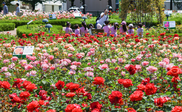 22일 오후 부산 기장군 정관읍 윗골공원에 유메, 플로라콜로니아, 코사이, 신데렐라 등 다양한 종류의 장미꽃이 만발해 시민들의 눈길을 사로잡고 있다. 김종진 기자 kjj1761@