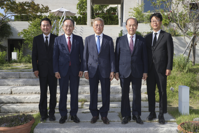 국민의힘 황우여 비상대책위원장과 추경호 원내대표가 23일 오후 경남 양산시 하북면 평산마을 문재인 전 대통령 사저에서 문 전 대통령과 함께 기념촬영을 하고 있다. 연합뉴스