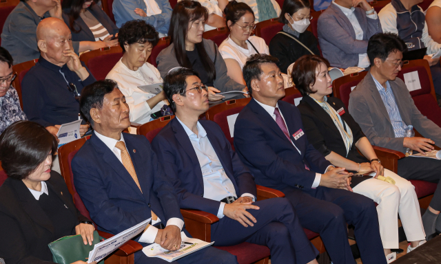 23일 부산 해운대문화회관에서 노후계획도시 관련 국토부 설명회가 열려 국민의힘 해운대갑 주진우(앞줄 왼쪽 세 번째) 당선인과 김성수 해운대구청장 등이 설명을 듣고 있다. 김종진 기자 kjj1761@
