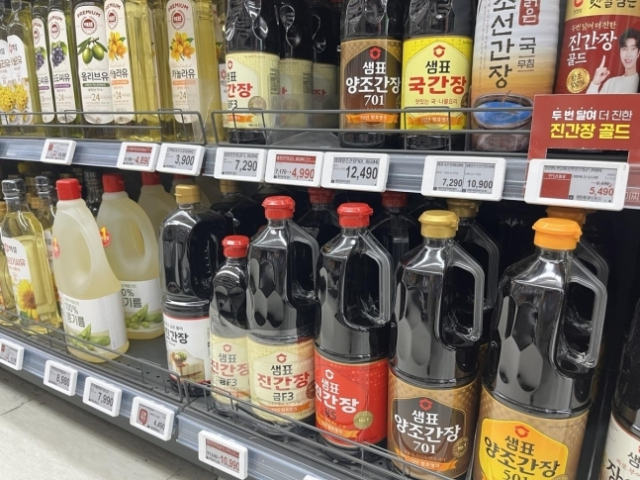 김과 식품 가격이 줄줄이 오르는 가운데 다음 달 1일부터 간장 가격도 오른다. 24일 슈퍼마켓에 진열된 샘표식품 간장. 연합뉴스