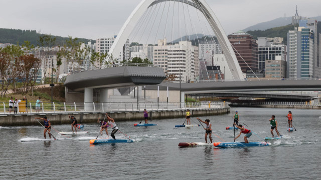 ‘2024 하버시티 동구 북항컵 SUP RACE’가 26일 부산 동구 북항 친수공원 경관 수로에서 열렸다. 참가한 선수들이 질주하고 있다. SUP(Stand Up Paddle)은 보드 위에 서서 노를 저으며 앞으로 나아가는 해양스포츠로, 파도를 탈 필요가 없고 초보도 쉽게 도전할 수 있어 인기가 높다.