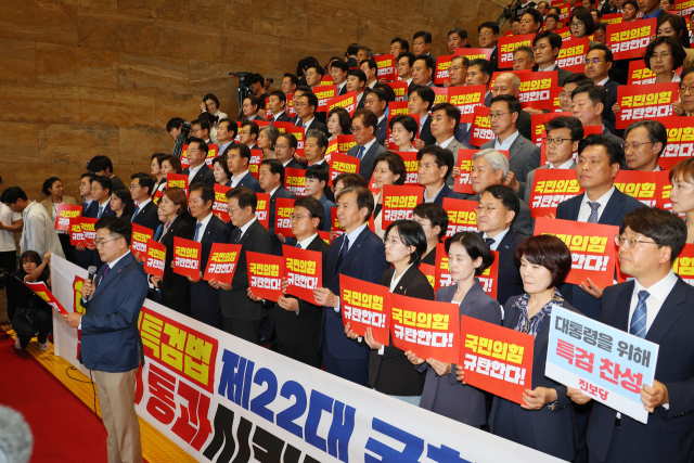 28일 국회 본회의에서 채 상병 특검법이 부결되자 야당은 강력 반발했다. 더불어민주당 등은 이날 재표결 직후 국회 본관 로텐더홀에서 ‘규탄대회’를 열었다. 박찬대 원내대표는 규탄대회에서 “국민은 오늘을 한 줌의 권력을 지키기 위해 국민의 목소리를 짓밟은 최악의 의회 참사의 날로 기억할 것”이라며 “재표결을 촉구했던 국민의 목소리를 집권여당은 철저하게 외면했다”고 주장했다. 박 원내대표는 “민주당은 22대 국회가 열리자마자 해병대원 특검법을 재추진하겠다”면서 “부당한 지시를 내린 책임자가 누구인지 밝혀내겠다”고 강조했다.