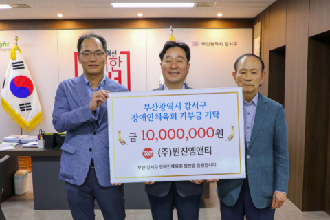 ㈜원진엠앤티(회장 이원주)는 5월 28일 장애인 체육 발전을 위해 써달라며, 부산 강서구 장애인체육회(회장 김형찬 강서구청장)에 기부금 1,000만 원을 기탁했다.
