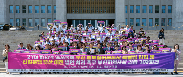 부산상공회의소(회장 양재생)는 13일(월) 오후 2시, 국회 본관 앞에서 부산상의 양재생 회장과 국민의힘 김도읍, 김미애 의원 등 현역 지역 국회의원 및 김대식 22대 국회의원 당선인 그리고 조정희, 박재율 대표를 비롯한 시민단체 등 120여명이 참석한 가운데 「부산글로벌허브도시 특별법 입법 및 산업은행 부산 이전 법안 처리 촉구를 위한 부산 지역사회 국회 방문 긴급 기자회견」을 개최하였다.