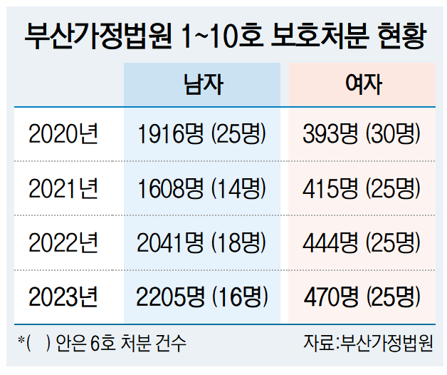 29일 부산가정법원에 따르면 부산 지역 남자 소년 범죄 보호 처분은 2020년 1916건, 2021년 1608건, 2022년 2041건, 지난해 2205건으로 증가세다.