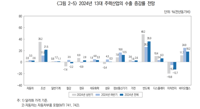 이어 조선(21.5%), 바이오헬스(18.2%), 디스플레이(6.3%), 가전(2.6%) 등 대부분 업종의 수출도 증가하겠지만, 업황 부진 등으로 철강과 이차전지 수출만 전년보다 2.2%, 12.7% 감소할 것으로 예상됐다.