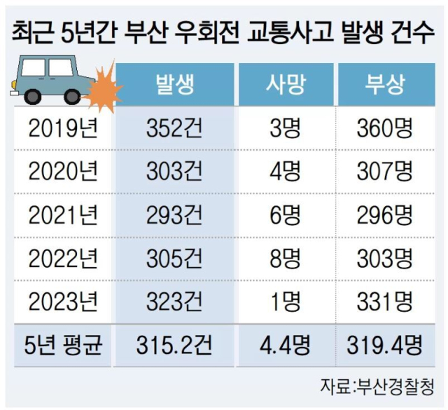 우회전 일시정지를 의무화한 새 법규는 지난해 시행됐지만, 여전히 우회전 교통사고는 줄어들지 않고 있다. 2일 부산경찰청에 따르면, 지난해 부산에서 발생한 우회전 교통사고는 323건으로 오히려 2022년 305건보다 더 늘었다. 올해도 지난 3월 26일 부산 기장군에서 우회전하던 학원 버스에 자전거를 타고 가던 중학생이 치어 숨지는 등 우회전 교통 사망사고가 이어졌다.