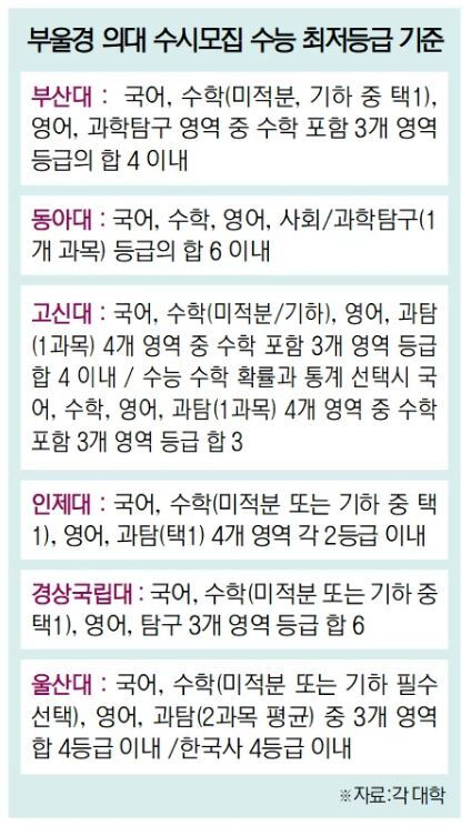 부산대 의대는 ‘국어, 수학(미적분, 기하 중 택1), 영어, 과학탐구 중 수학 포함 3개 영역 등급 합 4 이내’를 적용한다. 고신대 의대는 부산대와 같다. 단, 수학 선택과목을 ‘확률과 통계’로 고르면 국어·수학·영어·탐구 중 수학 포함 3개 영역 등급 합 3 이내이다. 동아대 의대는 ‘국·수·영어·사회/과학탐구(1개 과목) 4개 등급의 합 6 이내’이다. 인제대 의대는 국어·영어·수학(미적분·기하 중 택1)·과학탐구(택1) 4개 영역 각 2등급 이내다.