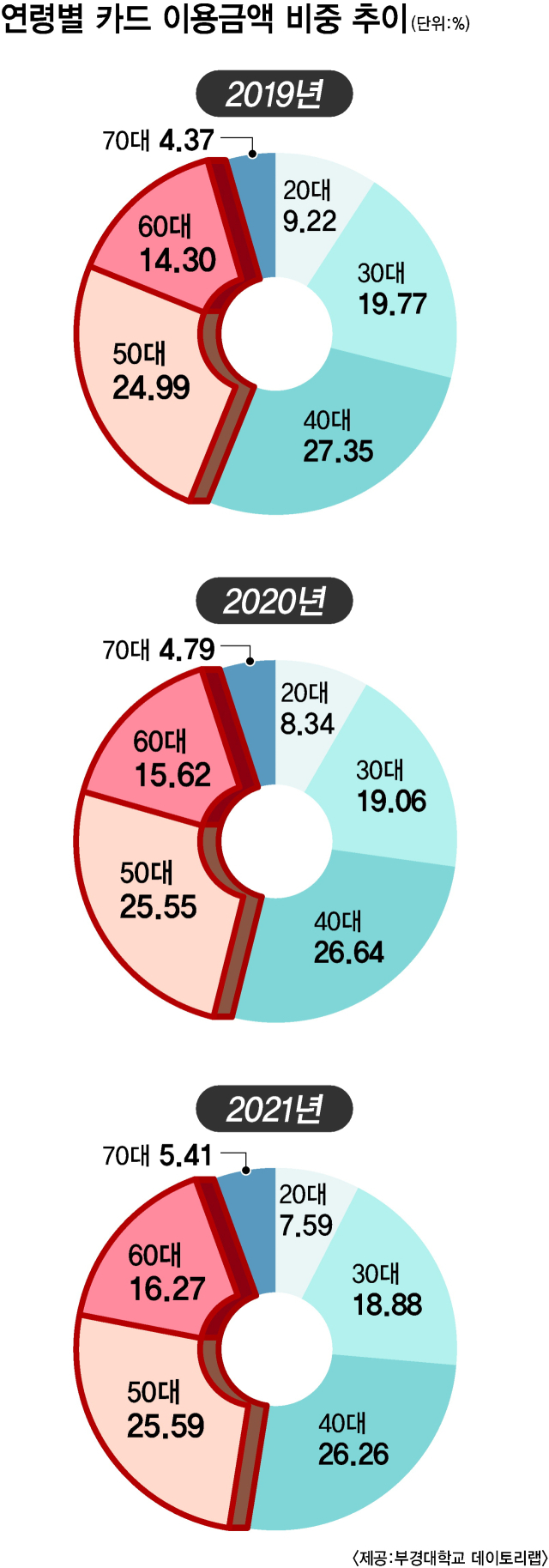 5060세대의 안정적인 경제력은 소비에서도 증명된다. 부경대학교 데이토리랩이 부산시 오픈 데이터를 토대로 분석한 결과에 따르면 2019년부터 2021년 사이 부산에서 소비 금액(신용카드 기준)은 전 연령대에서 감소했지만, 50대와 60대만 늘었다. 2019년 전체 소비 금액에서 50대가 차지하는 비중은 24.99%였지만 2021년에는 25.59%로 소폭 상승했다. 60대는 같은 기간 14.30%였던 비중이 16.27%까지 높아졌다.