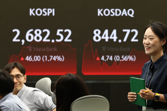 코스피가 2682.52로 장을 마친 3일 오후 서울 중구 하나은행 딜링룸. 연합뉴스