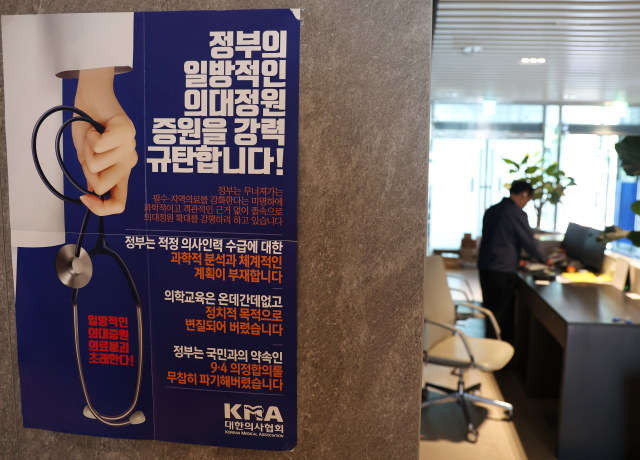 지난 2일 서울 의사협회 회관에 정부의 의대 증원 정책을 규탄하는 포스터가 붙어 있다. 연합뉴스