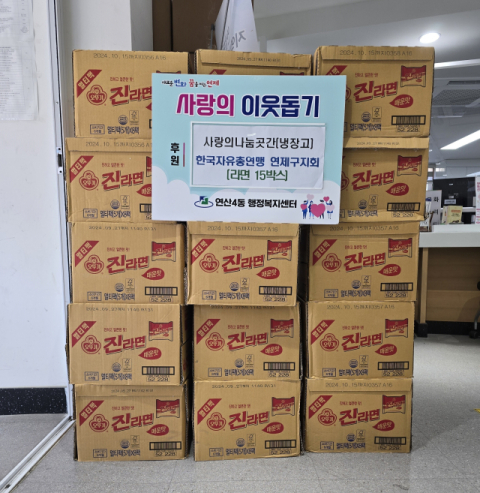 연제구 연산4동(동장 김외경)은 지난달 29일 강생일 한국자유총연맹 연제구지회장으로부터 라면 15박스를 기탁받았다.
