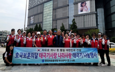 한국자유총연맹 부산중구지회(회장 이희산)는 호국보훈의 달을 맞이하여 지난 6일 광복로 일원에서 태극기 나눔 행사를 개최했다.