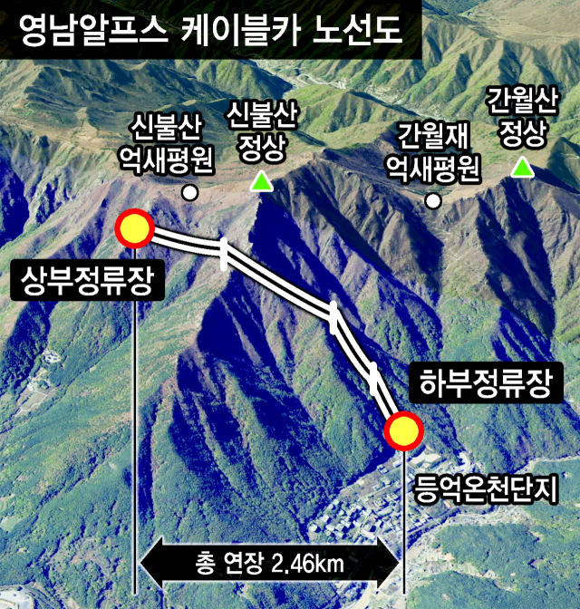 환경영향평가 초안의 주요 내용을 보면 케이블카는 신불산 억새평원 일원(상부정류장)에서 등억집단시설지구(하부정류장)까지 전체 연장 2.46km로 조성한다. 상하부 정류장 위치가 조정되면서 전체 연장이 0.02km 줄었다. 중간지주는 기존 계획대로 3개를 설치한다. 시간당 최대 1500명이 탈 수 있는 10인승 캐빈 60대(보조 10대 포함)를 운영한다. 내년 1월 착공, 2026년 6월 준공 예정이다. 전액 민자로 644억 원이 투입된다.