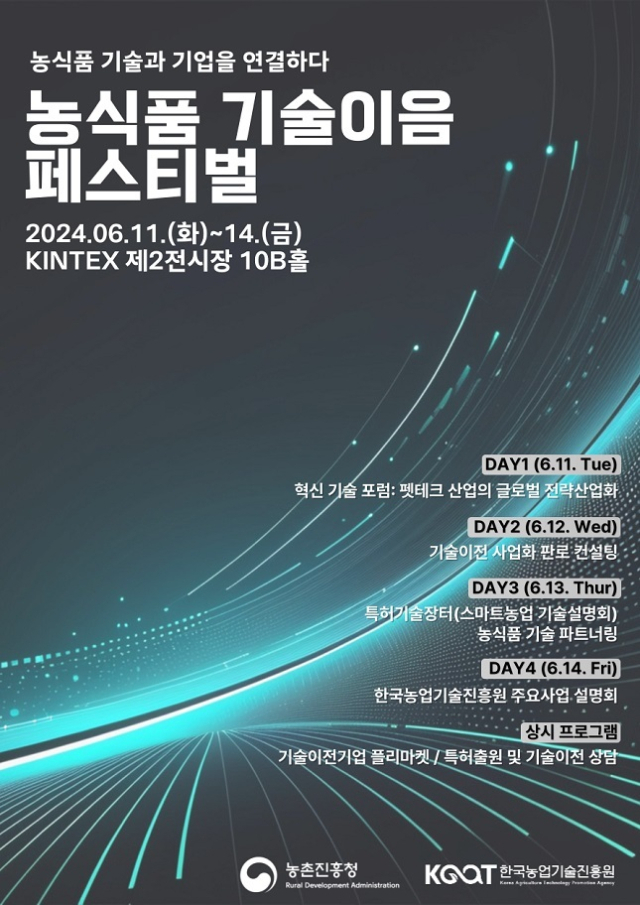 한국농업기술진흥원은 오는 6월 11일부터 14일까지 열리는 ‘2024 농업기술박람회’ 내에 ‘농식품 기술이음 페스티벌’을 운영한다고 10일 밝혔다. ‘농식품 기술이음 페스티벌’은 농업의 첨단기술과 기업을 연결해 농업기업에 새로운 사업 기회를 제공하기 위해 마련됐다.