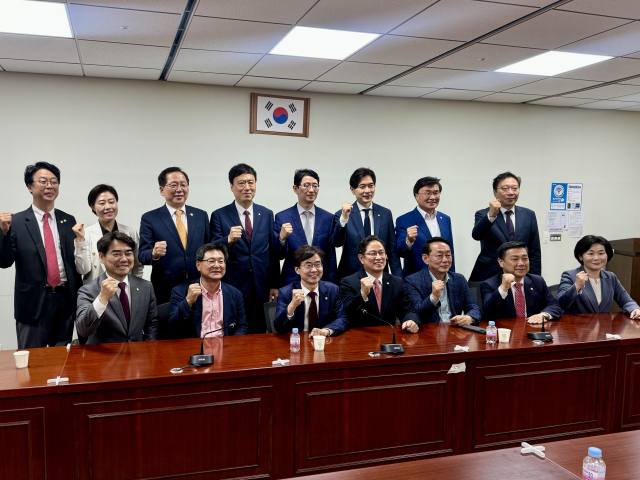국민의힘 부산 의원들이 10일 간담회를 열고 재선의 박수영 의원을 부산시당위원장으로 추대하기로 합의한 뒤 파이팅을 외치는 모습. 김희정 의원실 제공