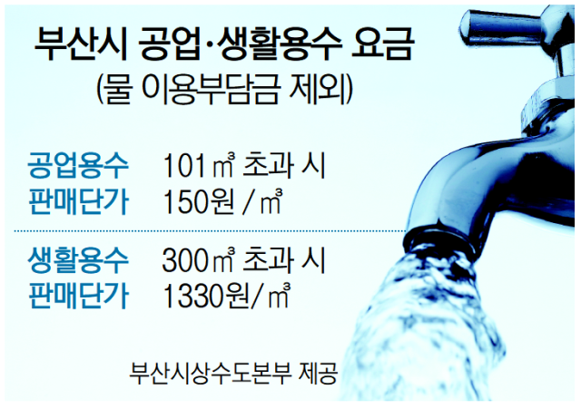 10일 부산시·산단발전협의회 등에 따르면 동남권방사선의과학산단, 기장대우1·2산단, 장안산단 등 동부산권 14개 산단은 공업용수 공급 지역과 비교해 연간 100억 원가량을 수도 요금으로 더 지불하고 있다. 현재 부산시의 수도 사용료는 물이용부담금을 제외하고 생활용수가 t당 1330원(300t 초과 시)으로, 공업용수 150원(101t 초과 시)의 8배 규모다.