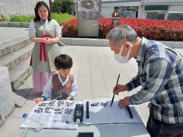 부산진성 서문 성곽우주석에 새겨진 ‘서문쇄약’과 ‘남요인후’를 붓으로 쓰고 있는 시민. 래추고 마을 관리 사회적 협동조합 제공