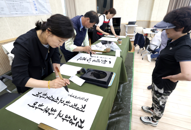 부산 강서구청이 ‘효도하는 강서’를 기치로 ‘가훈 나눔’ 행사를 열었다. 11일 오후 강서구 명지동 명지노인종합복지관에서 우농문화재단 서예가들이 주민을 대상으로 한지에 가훈을 써주고 있다.
