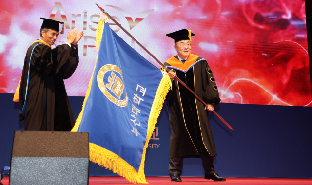 부산대학교 제22대 최재원 신임 총장의 취임식이 11일 오전 교내 10·16기념관에서 열렸다. 최 총장이 교기를 인계받고 있다. 정대현 기자 jhyun@
