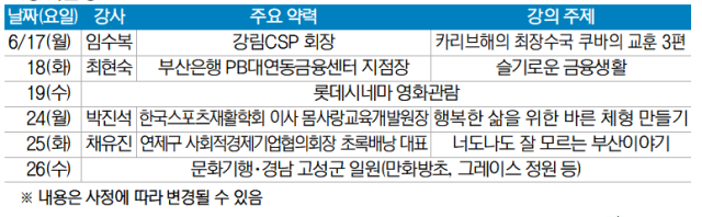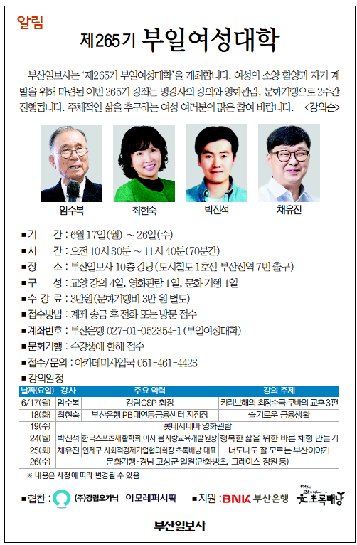 부산일보사는 '제265기 부일여성대학'을 개최합니다. 여성의 소양 함양과 자기 계발을 위해 마련된 이번 265기 강좌는 명강사의 강의와 영화관람, 문화기행으로 2주간 진행됩니다. 주체적인 삶을 추구하는 여성 여러분의 많은 참여 바랍니다. 〈강의순〉