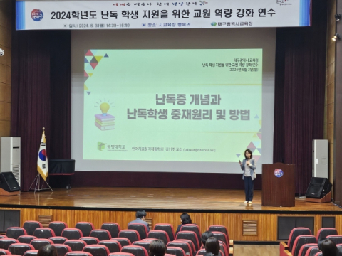 김교수는 지난달 5월 9일에는 부산광역시교육청 교육연수원에서 ‘모든 학생의 기초학력 보장 책임교육(난독, 난산 학생 지원)’을 주제로 초등직무연수를 가졌으며, 지난 6월 3일 대구시교육청에서 초중등교사 100여명을 대상으로 ‘난독 학생 지원을 위한 교원 역량 강화’ 연수를 갖기도 했다.